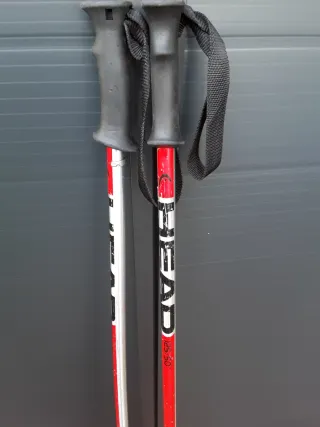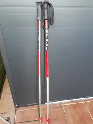 Bastones de esquí de la marca Head con una longitud de 125 cm. Son ideales para la práctica del esquí. - Color plateado con detalles en rojo y negro. - Empuñaduras ergonómicas negras. - Correas de sujeción negras. - Puntas rojas.