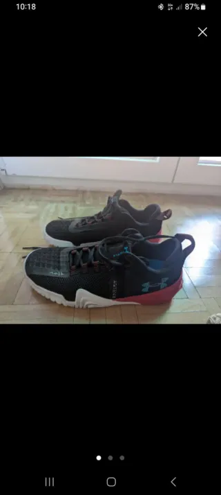 Zapatillas deportivas Under Armour diseñadas para CrossFit. - Color negro con detalles en rojo y azul. - Cierre de cordones. - Suela blanca.