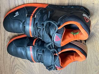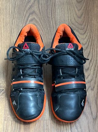 Zapatillas Reebok para halterofilia y CrossFit. - Talla 41.5 - Color negro con detalles naranjas. - Cierre de velcro y cordones. - Logo de Reebok en la lengüeta. - Suela de goma. - Diseño específico para entrenamiento.