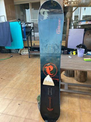 Tabla de snowboard de 1'55 que utilizé para aprender a hacer Snow. Tiene bastante uso, aunque se conserva en buen estado excepto las fijaciones, que hay una con el cierre roto (habria que ir a la tienda y cambiarlas por unas nuevas)
