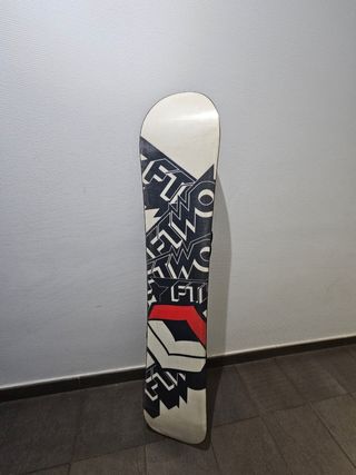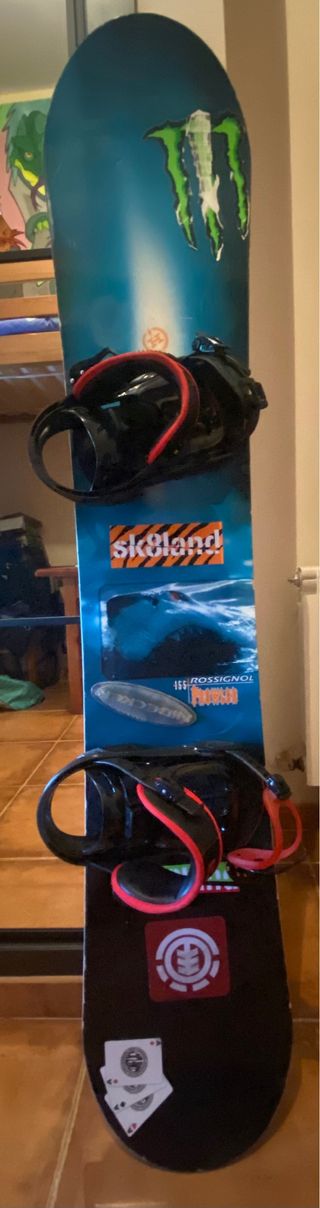 Tabla de snowboard con fijaciones. Perfecta para iniciarse. Mide 1.48 m de largo. Está lista para utilizarse. Ahora está configurada en modo "goofy" aunque se puede cambiar a "regular" con un simple destornillador de estrella. La parte de atrás se despegó y se reparó. Después de la reparación se ha usado más de 25 días a lo largo de varios años sin ningún problema.