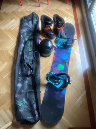 vendo equipo completo de mujer Snow yo mido 1.70 y peso 68 kilos se compone de tabla en muy buen estado con su funda , con fijaciones botas marca 32 con talla 38 y medio y bolsa para guardarlas.. casco y manoplas negras de decatlon.... asi como pantalon snow imitacion vaquero y cazador 3/4 marca Burton No le falta detalles solamente necesita de tus gamas de nieve Urge vender por tema. Espacio Tabla con fijaciones y botas lo vendo por separado