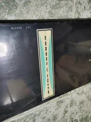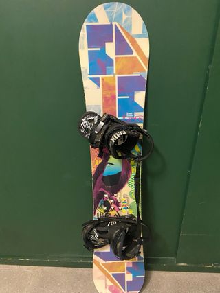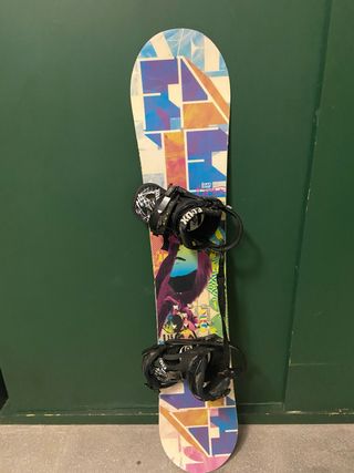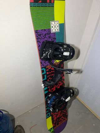 Tabla de snowboard con un diseño colorido y llamativo. Incluye las fijaciones. Esta en muy buen estado - Diseño gráfico abstracto. - Fijaciones negras. La piel esta un poco desgastada, pero funcionan bien