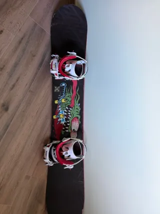 Tabla de snowboard con un diseño llamativo de dragón verde y rojo. Incluye fijaciones. Recién encerada - Diseño gráfico de dragón. - Fijaciones incluidas.