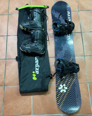 Conjunto completo para disfrutar del snowboard. - Tabla de snowboard Tijuana. - Botas de snowboard negras Tijuana talla 42 - Funda de transporte negra Wed'ze.