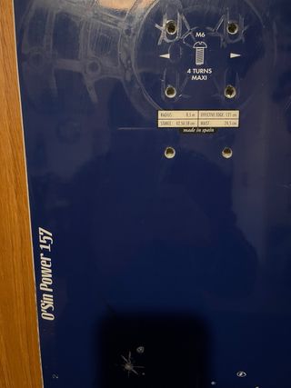 Tabla de snowboard con un diseño blanco y detalles en madera y azul. Incluye fijaciones. Largura de 157 cmts. Se entrega en mano.