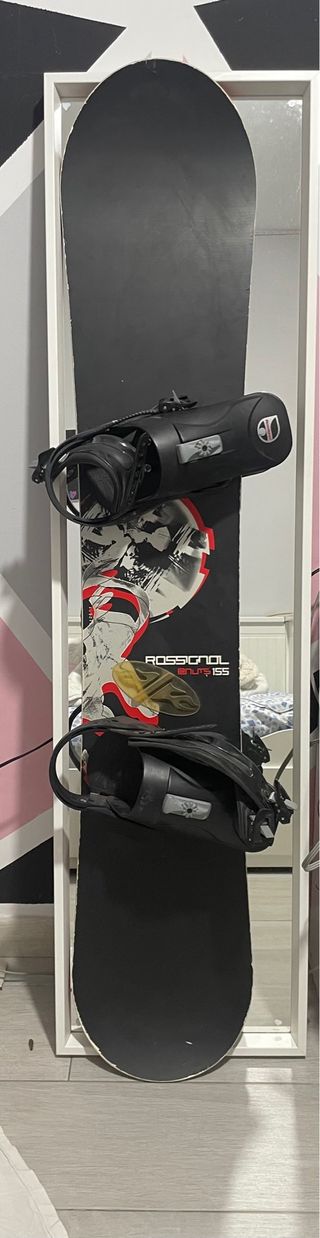 Tabla de snowboard Rossignol, modelo 155, con muy poco uso. - Diseño deportivo en negro y blanco. - Fijaciones incluidas.