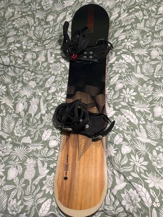 Tabla de snowboard lista para la acción, con un diseño llamativo y fijaciones incluidas. 158 W. Se vende por no usar con funda - Diseño con motivos de madera y rocas. - Fijaciones negras ajustables. - Incluye bolsa de transporte negra.