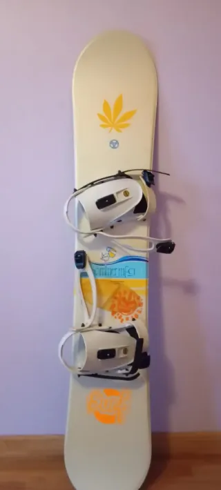 Tabla de snowboard con fijaciones. - Diseño con hoja amarilla. - Fijaciones blancas y negras. - Funda incluida.
