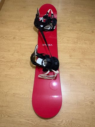 Tabla de snowboard de 155cm de largo, lista para la montaña. Incluye fijaciones. - Diseño con detalles en rojo y negro. - Fijaciones negras ajustables.