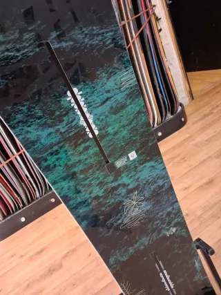 Tabla de snowboard Burton con un diseño único. - Base de madera con detalles en negro. - Fijaciones Burton.