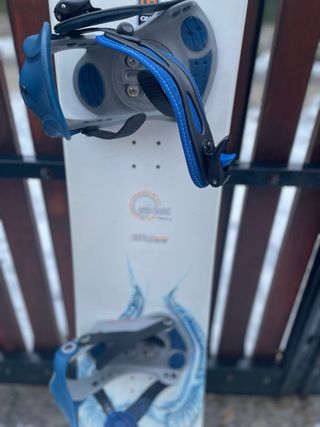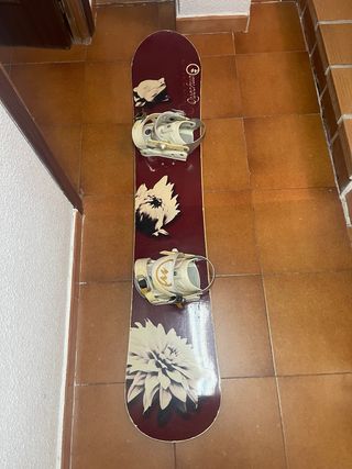 Medida 148cm. Marca quechua. Las marcas que se pueden ver en las dos ultimas fotos son del dibujo de arriba la tabla esta bien. Perfecta para iniciación y evitar largas colas en el alquiler de material - Fijaciones de snowboard. - Diseño gráfico en la tabla.