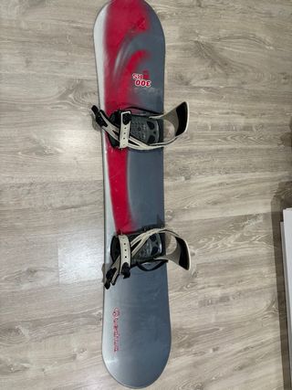 Tabla de snowboard de la marca Quechua en color rojo. - Diseño con estampado gráfico. - Fijaciones incluidas. Las fijaciones tanto las correas como lo de material está cuarteado pero lo metálico está correcto. Es de no haber usado.