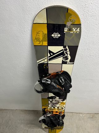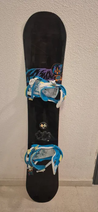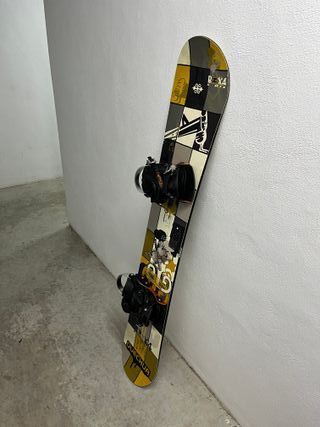 Tabla de snowboard con poco uso pero con golpe en un extremo lateral. No impide ser usada, pero por ello es buena opción como tabla de uso casual o de aprendizaje. Mide 1.50m aproximadamente de largo. Incluye funda de transporte y sujeciones. Se encuentra en zona metro Canillas