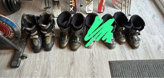 Lote de equipo de esquí y snowboard. SE PUEDEN VENDER POR SEPARADO Los esquis son de 1.74 el primero y 1.70 el segundo. Las botas por orden de números son de izquierda derecha 29 y medio, 29 y 26 Hay 2 bastones incluídos. Las botas son: las primeras salomon y las segundas y ultimas nordica. los esquis son rossignol y fisher Tabla de snowboard Elan RS Rocker de 151 cm (reservada) - Fijaciones incluidas. - Modelo RS Rocker. - Longitud 151 cm. Chaqueta quechua L en buen estado (reservada). Esquis de 1.50 de marca fisher con botas incluidas. Los esquis estan encerados.
