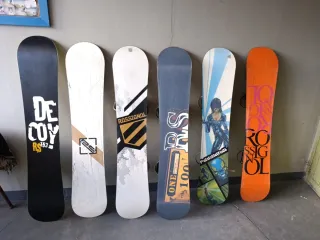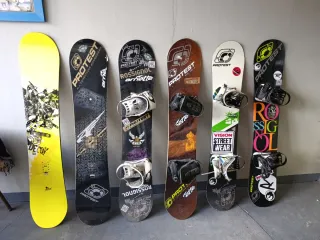 Conjunto de tablas de snowboard de varias marcas, incluyendo Protest y Rossignol. Diseños variados y llamativos. - Tabla rossignol amarilla con diseño gráfico. Sin usar: 180€ - Tabla Rossignol negra con detalles grises y blancos, 150cm. Muy usada: 35€ - Tabla Rossignol negra con texto blanco y rosa 150cm, con fijaciones blancas, todo gama alta. Poco uso: 250€ - Rossignol marrón 153cm gama alta,con fijaciones. Poco uso230€ - Tabla Protest blanca con detalles verdes y rojos.gama alta.Usada 390 - Tabla Rossignol negra con texto multicolor. Gama alta 420€