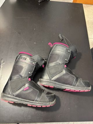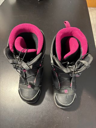 Botas de snowboard Salomon en color negro y rosa, talla 41. - Cierre con cordones. - Interior acolchado para mayor comodidad. - Logo de Salomon en la lengüeta. Fijaciones para tabla Rossignol. Se vende junto o separado.