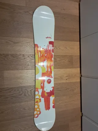 Tabla de snowboard de 156 cm con un diseño llamativo,usada pero de cantos y suela en perfecto estado, para encerar y disfrutar de la nieve con una gran tabla. - Fabricación suiza. - Modelo 24/7. - fijaciones Drake (muy cómodas)