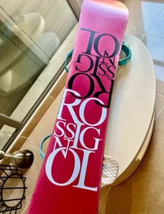 Tabla de snowboard de la marca Rossignol. Diseño moderno y llamativo. - Base de color rojo vibrante. - Parte superior con degradado rosa y naranja. - Logotipo grande de la marca en blanco y negro.fijaciones BURTON