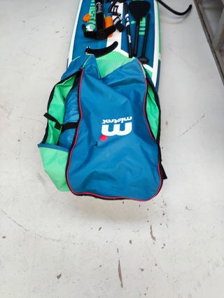 Tabla de Stand Up Paddle de la marca Mistral, con un diseño moderno en tonos verdes y azules,en perfecto estado. - Medidas en las fotos. - Diseño con cordones elásticos en la parte delantera. - Asa central para facilitar el transporte. - Válvula de inflado. - Aleta central. - Logo de Mistral en la parte superior e inferior. - Incluyo también remo de fibra de vidrio y carbono.