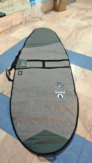 Funda para tabla de paddle surf. Protege tu tabla de golpes y arañazos. - Color gris con detalles en verde. - Cierre con cremallera. - Correa para colgar.