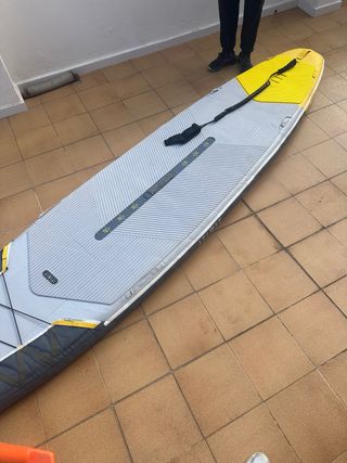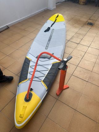Tabla de paddle surf hinchable de gran tamaño, ideal para disfrutar del agua. - Diseño en gris y amarillo. - Superficie antideslizante. - Tiene algunas marcas de uso que se ven en las fotos. - va con el hinchador pero sin remo.