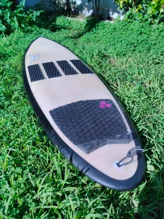 Usada un verano para aprender a hacer surf. Tabla de surf epoxy con un diseño de madera y borde negro. Tiene varios arreglos que afectan a la estética, la tabla esta en perfectas condiciones. Incluye funda, invento y quillas. - Marca: MB - Material: Madera - Borde: Negro