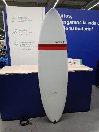 Tabla de surf evolutiva de 7 pies y 2 pulgadas. Ideal para progresar en el surf. - Diseño con líneas rojas y blancas. - Quillas negras. - Pad de agarre en la cola. Con funda e invento