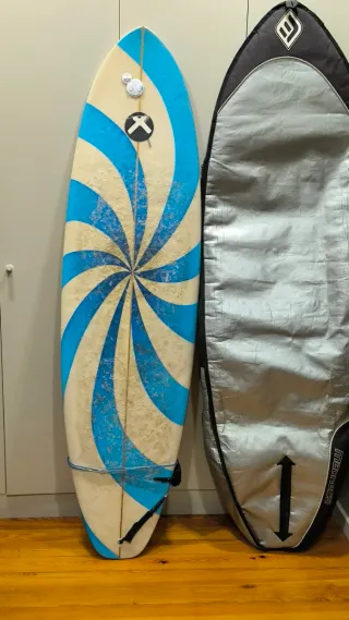 Vendo tabla de surf por no usar, marca Eukaliptus, es de fibra de vidrio 6,4 estilo evolutiva, muy buena para empezar e ir cogiendo nivel. incluye funda rigida Madness ideal para transportar. La tabla ha estado siempre guardada y no tiene ninguna reparación. No realizo envios. Zona Ametzola No leer. Surf, Barato, buen precio, buen estado, al merrick, pukas, playa. - Medida: 6'4 - Diseño de espirales azul y blanco - Incluye leash y tapón para leash - Incluye funda rígida de calidad