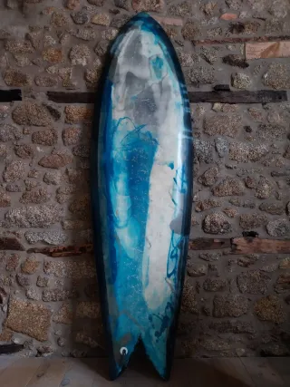 Tabla de surf estilo Fish con un diseño artístico en tonos azules y blancos. Ideal para disfrutar de las olas. Muy fácil cojer las olas