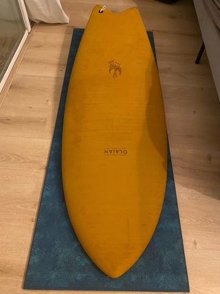 Tabla de surf OLAIAN de color mostaza medidas en la foto tiene protegido las colas