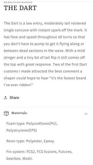 Tabla de surf de 6.6 pies. WEBBERSURFBOARDS THE DART La Dart es una tabla cóncava simple de entrada baja y rocker de cola moderado, con chispa instantánea desde el principio. Tiene fluidez y velocidad en todos los giros, así que no tienes que bombear para que vuele a lo largo de la ola ni entre las secciones muertas. Con un ligero stinger y un ligero tail flip, arranca con gran respuesta. 66 20 ¾ 2 ⅞ 43L