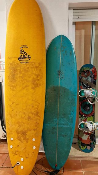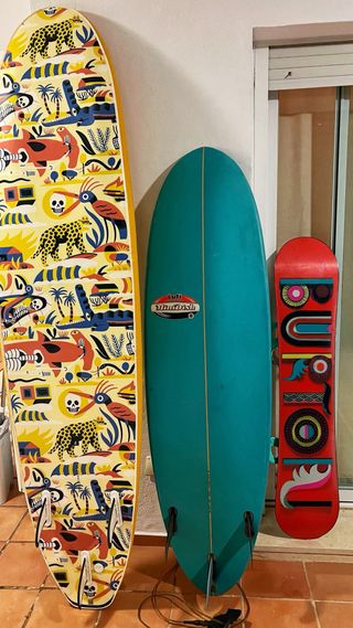 Tablas de surf y snowboard. - Tabla de surf Olaian con diseño colorido y estampado. Soft top 7’8, ideal para principiantes. 140€ (reservada). - Tabla de surf de color verde azulado. Hard top 180€ - Tabla de snowboard Burton con fijaciones. 170€ Todas con muy poco uso.