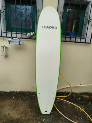 Tabla de surf Seaded de 8 pies y 2 pulgadas, ideal para iniciación. Viene con funda. - Color verde brillante. - Diseño para principiantes. - Incluye funda de transporte - No incluye invento. - 2 quillas nuevas. - se entrega con cera. - se detalla un golpe que fue arreglado en el momento por el anterior dueño (que es amigo) - Se tiene que recoger. Medidas 250*58*7 cms