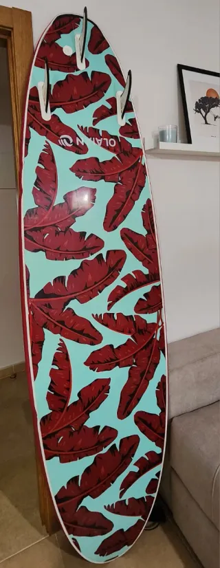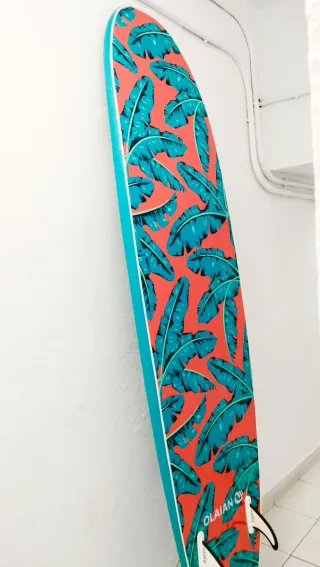 Tabla de surf con un diseño llamativo de hojas tropicales en tonos turquesa y negro. Ideal para iniciarse en el surf (begginers). Material de espuma (foam). Lleva algun raguño pero no afecta para nada a la funcionalidad de la tabla. Tamaño 8” (pies). Se vende con leash para poder atarla al pie. Entrega en persona no se hacen envios. - Marca OLAIAN Decathlon