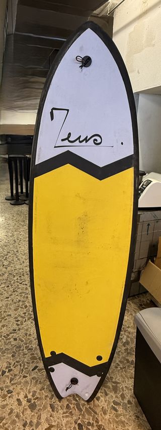 Tabla de surf tipo soft (corchipan) con un diseño llamativo. - Parte superior blanca con el nombre Zeus escrito. - Zona central amarilla con un patrón en zigzag negro. - Parte inferior blanca con detalles negros y el tail. - Incluye un leash negro en la cola. 6'2" - 40.4L