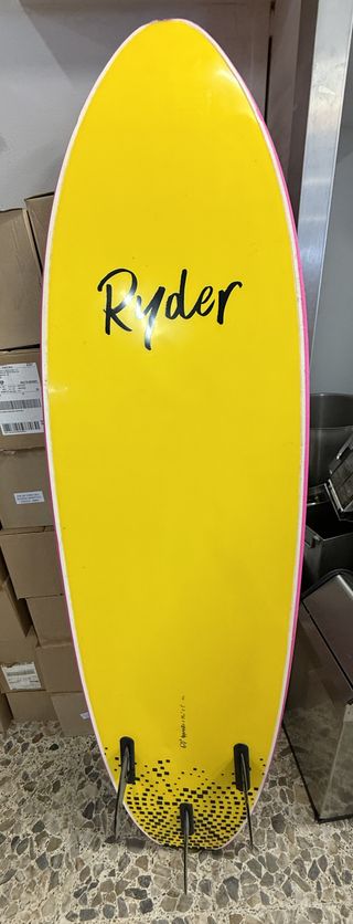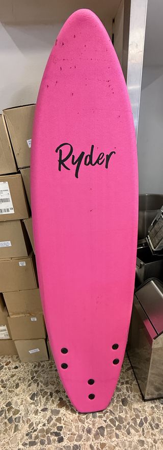 Tabla de surf tipo soft en color rosa, con el nombre Ryder escrito. - Diseño tipo soft (corchipan). - Color rosa vibrante. - Nombre Ryder en la parte superior. 6'0" - 47L