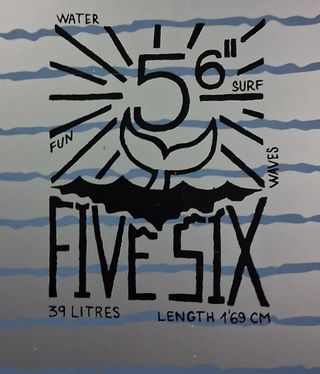 Tabla de surf Five Six de 5 pies y 6 pulgadas, con un volumen de 39 litros y una longitud de 1,69 cm. Incluye un regalo. - Diseño Five Six con ballena y olas. - Medidas: 5'6 (1,69 cm). - Volumen: 39 Litros. - Incluye regalo adicional.
