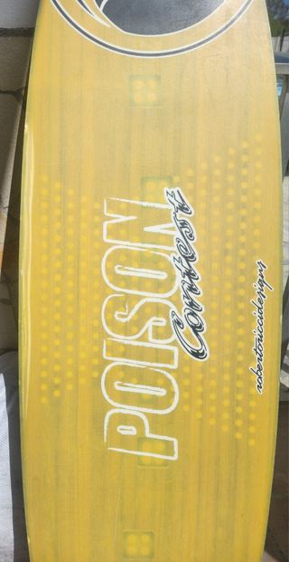 Tabla de kite surf marca Poison, modelo Contest. Diseño llamativo en color amarillo. - Logo Poison Contest en blanco. - Firma robertoriccidesigns en lateral.