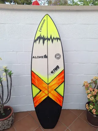 Tabla de surf Alone twin fin, nueva, sin uso. Fue un capricho que nunca use. Viene con el go pad de Machado valorado en 50€ Medidas 5'8 x 20 5/8 x 2 3/8 - 32.7 litros. quillas future INCLUIDAS