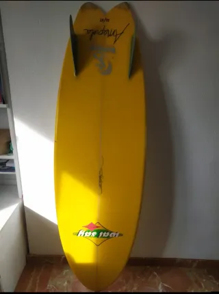 Tabla de surf Watsay modelo Amapola Fish. Lista para surfear. Precio algo negociable. - Color amarillo. - Diseño de aletas twin fin. - Firma del shaper visible.
