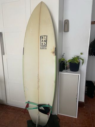 Tabla de surf de la marca BLANKS SURF BOARDS. - Diseño con franjas de color verde y gris. - Parte superior en color crema. -arreglo visible en la foto