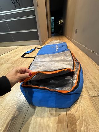 Funda para tabla de surf de color azul con detalles naranjas. - 2.20 cmtrs - Cremallera frontal. - Interior plateado. - Correa ajustable. - Bolsillo interior