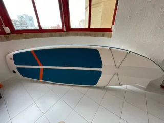 Tabla de paddle surf en excelente estado, utilizada solo en tres ocasiones. Ideal para disfrutar del agua. - Diseño moderno con detalles en azul y naranja. - Asa central para facilitar el transporte. - Cuerdas elásticas en la parte delantera para sujetar carga.