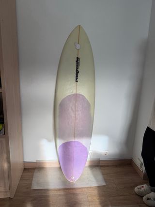 Tabla de surf que ha sido restaurada. Presenta un diseño bicolor con la parte superior en color blanco crema y la inferior en morado, separadas por dos finas líneas blancas. - Perfecta para todo tipo de olas -Nivel avanzado -Quillas de quitar y poner, diseñadas para en caso de colisión con ellas no rompan tu tabla y solo se rompan las propias quillas.