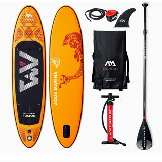Tabla de paddle surf hinchable Aqua Marina Fusion 10'4" en buen estado. Ideal para principiantes y para disfrutar en aguas tranquilas. Se incluye remo, bomba, aleta y mochila. - Incluye todos los accesorios que se ven en la imagen. - Perfecta para salidas individuales o en pareja. - Diseño naranja vibrante y detalles en negro. - Ligera y fácil de transportar.