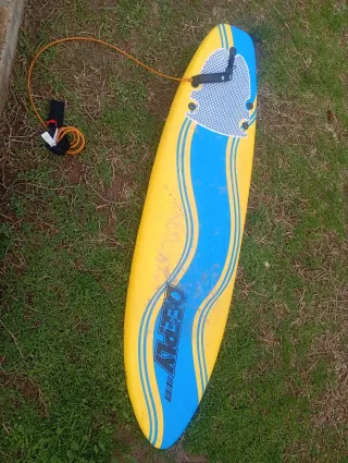 Tabla de surf de color amarillo con detalles en azul. Ideal para disfrutar del mar. - Diseño con franjas onduladas. - Incluye olaian naranja. - Marca: DEEPLY 6.0 no tiene apenas uso cualquier duda pregunte