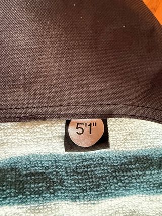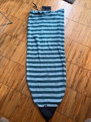 Funda de punto para tabla de surf de 5'1 pies. Protege tu tabla con estilo. - Diseño a rayas en tonos verdes y azul claro. - Punta reforzada en color negro. - Cierre de cordón ajustable en la parte superior. - con bolsillo con vercro.