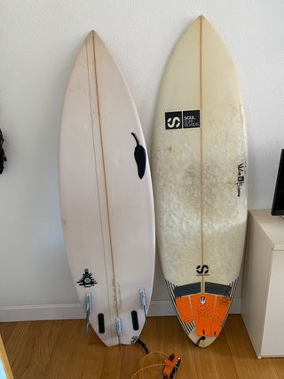 Conjunto de tablas de surf que incluyen fundas y quillas. Vendo estas dos tablas de surf que tantas alegrias me han dado. Las vendo con quillas, un invento y sus respectivas fundas. El precio por el pack completo de las dos tablas es de 310€