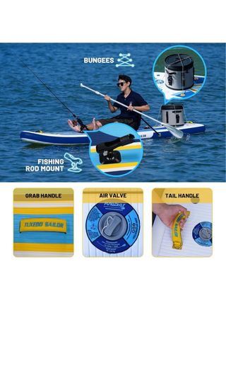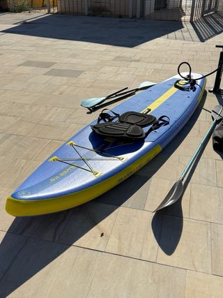 Tabla de paddle surf hinchable nueva . Ideal para principiantes y expertos. puedes usarla como kayak para ir a pescar - Medidas: 365cm x 86cm x 15cm - Capacidad de peso: 150kg - Incluye accesorios: remo, bomba, y bolsa de transporte. - Diseño azul y amarillo, muy atractiva.